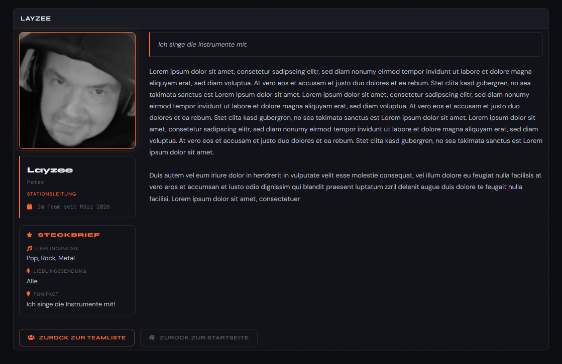 Moderne Moderatoren-Übersicht mit 3D-Flip-Cards, Live ON AIR-Badge via AzuraCast, Profilseiten mit TinyMCE-Editor, Showplan-Integration und Bewerbungs-Banner.