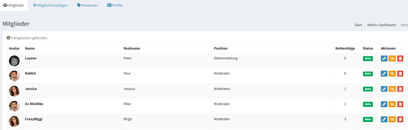 Übersicht aller Mitglieder mit Avatar, Name, Position und Sortierungswert.