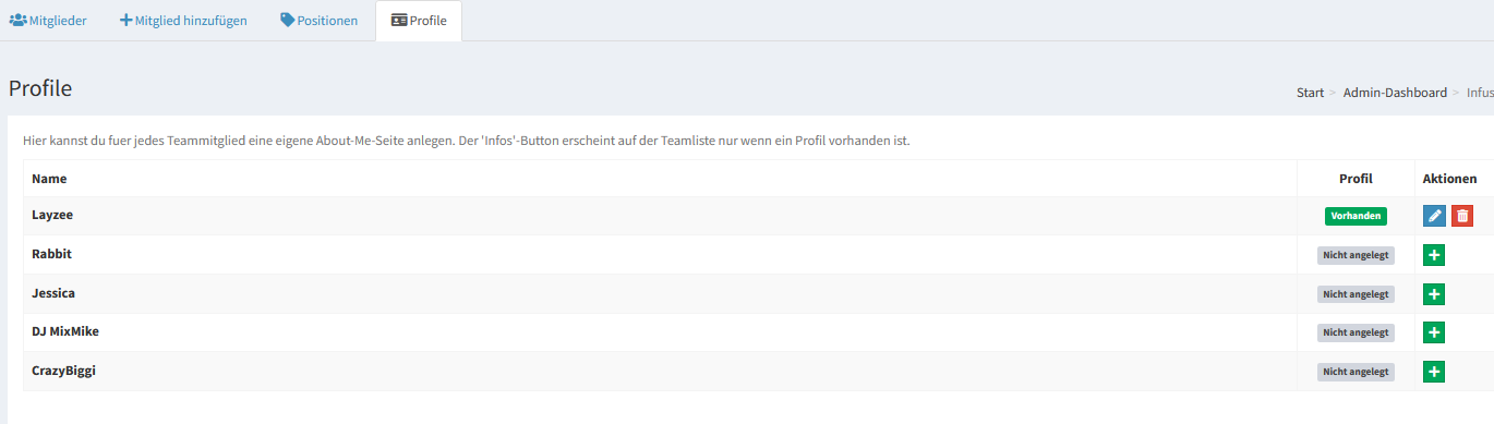 Teammitglieder werden im Adminbereich übersichtlich angezeigt und können dort gelöscht und bearbeitet werden.