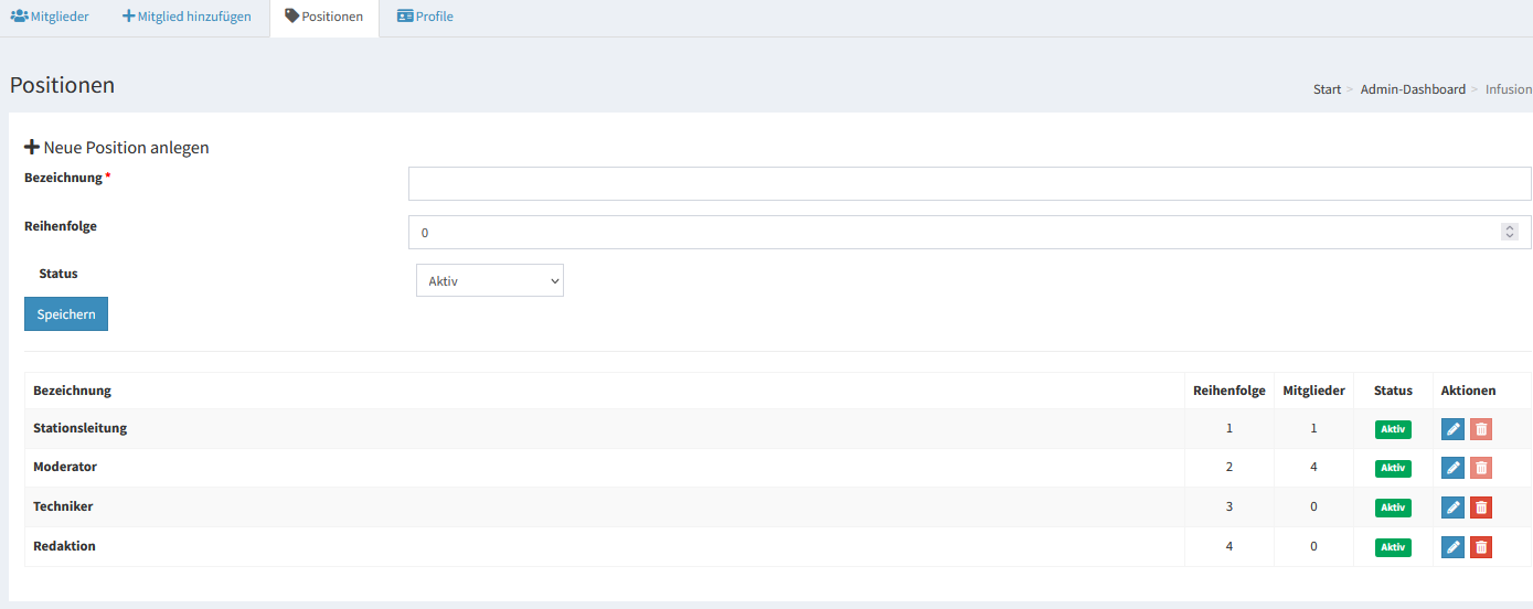 Positionen anlegen, umbenennen, sortieren und deaktivieren. Löschen nur möglich wenn keine aktiven Mitglieder zugewiesen sind.